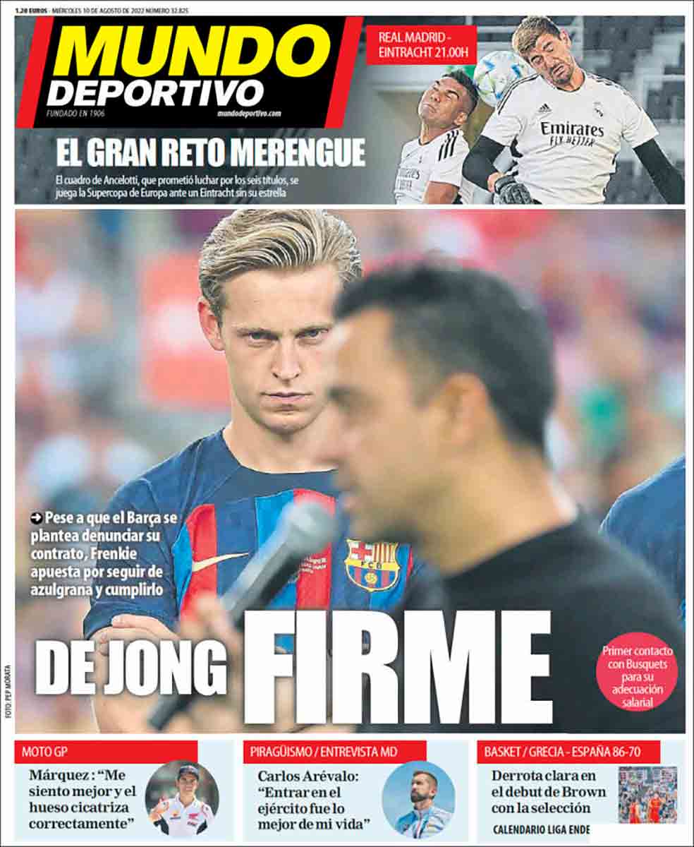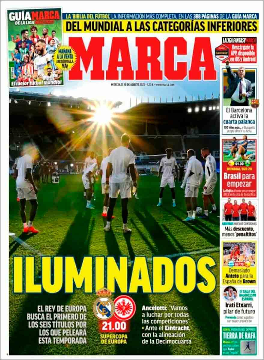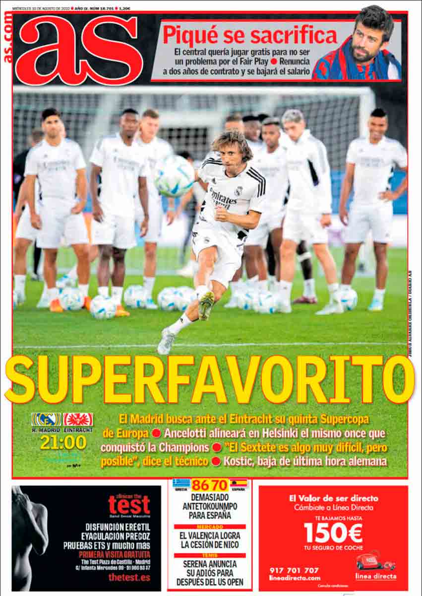 “Superfavorito”, titula As, con la carga de presión que eso conlleva. La Supercopa no deja de tener un cariz incómodo para el que llega allí como campeón de Champions, pues parece obligado a ganar al campeón de una competición menor como la Europa League. Así, la sensación es que hay cierto prestigio en juego, que ganar no te va a deparar mucho más pero perder te lo va a restar en mayor cuantía. A estas sensaciones, características de la competición por definición, se une lo que estamos viendo estos días, es decir, pintar al Eintracht como unos piernas con menos fútbol en las botas que Pocoyó, que no lleva ni botas.