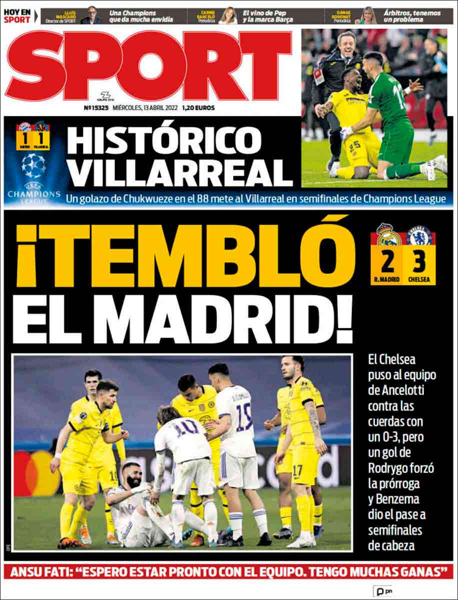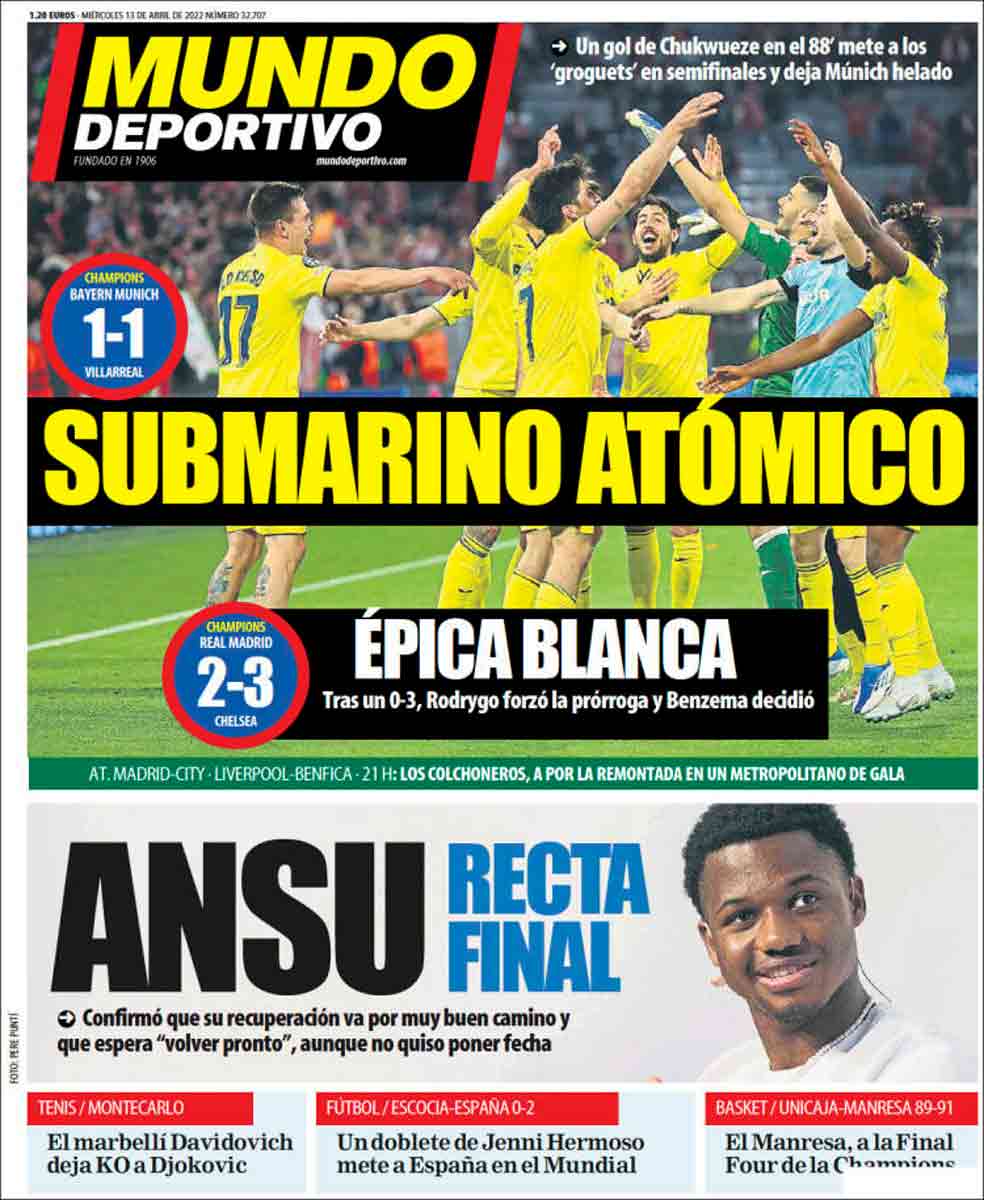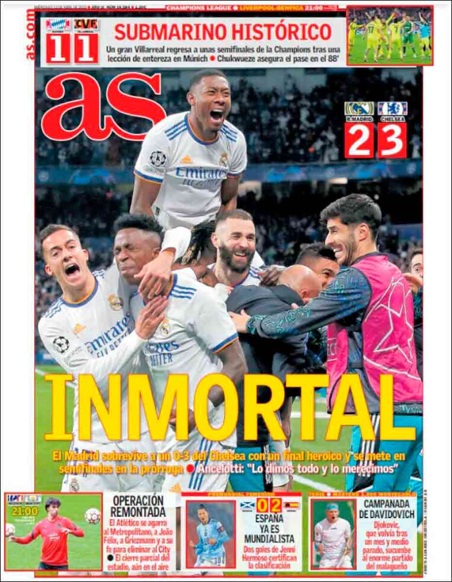 Fue en efecto una noche de delirio para el fútbol español, con el Real Madrid desafiando a la lógica y a un descomunal Chelsea para superar de manera agónica, en la prórroga, el impecable planteamiento de Tuchel, y con el Villarreal aguantando el chaparrón muniqués para alcanzar alturas sorprendentes si uno se atiene a su currículum europeo. No debe molestarnos compartir portada de Marca con los amarillos, cuyo entrenador (Unai Emery) ha felicitado caballerosamente al Real Madrid en sus redes sociales. Vaya desde estas líneas nuestra felicitación, asimismo, para el excelente entrenador vasco, así como para los seguidores del club castellonense.