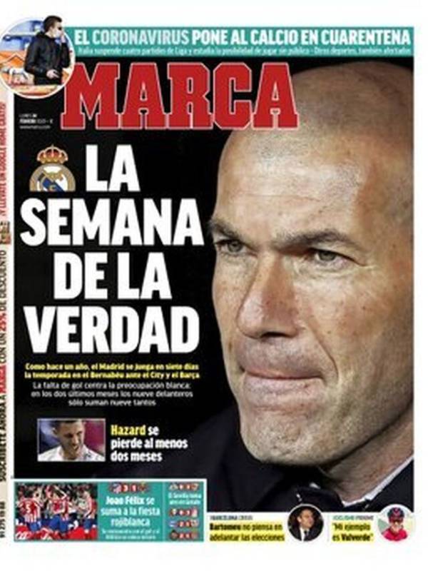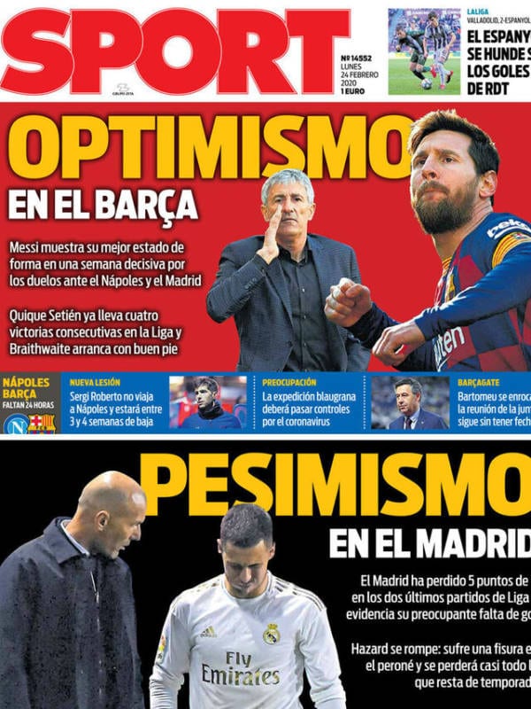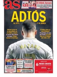 Sport va de luto a medias para poder dedicar la mitad superior de su primera plana al Barça, definido en cambio por un fondo rojo intenso de pasión y optimismo. Saca la lesión de Hazard como principal elemento de padecimiento madridista, y en eso hay que reconocer que acierta. Anda el madridismo definitivamente cabizbajo a cuenta de la pérdida del belga para lo que queda de temporada, o así. La fórmula ya universalmente aceptada para definir lo ocurrido es que “ha recaído” de su lesión, una forma más o menos sibilina de dar a entender que Eden ha sido un fiasco, que el Madrid ha vuelto a fichar un cojo, que Hazard es Prosinecki reeditado. Lo cierto es que ha tenido la pésima suerte de recibir un golpe en la misma zona que la otra vez, encadenando así dos lesiones traumáticas idénticas. Una desgracia en dos actos que ya tiene al madridismo más avinagrado reclamando responsabilidades (no sabemos a quién se le reclaman responsabilidades por la desdicha, tal vez a Dios o al destino) y al antimadridismo diseñando memes con la gracia en las nalgas.