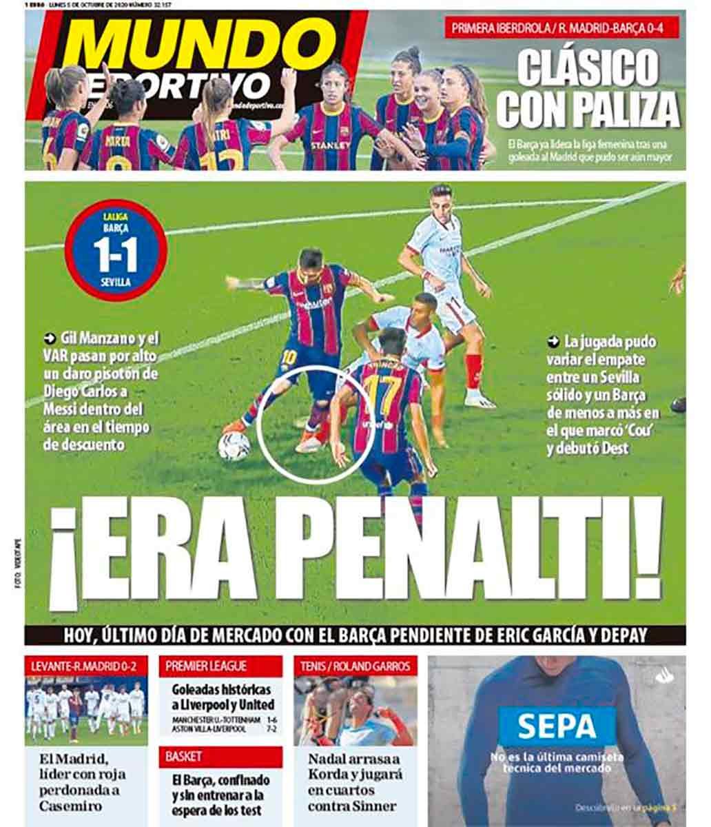 "El penalti a Messi fue claro, pero no se señaló en un Camp Nou sin público ni presión alguna, ya que los propios jugadores barcelonistas ni protestaron. (...) ni el VAR ni Gil Manzano vieron penalti en lo que parece una jugada clara. Esta Liga va a ser muy difícil para el Barcelona, como lo fue la pasada en la reanudación por la pandemia en la que las decisiones siempre beneficiaron al Madrid".