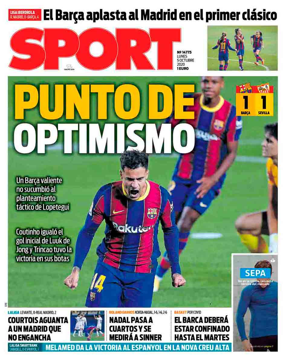 No creáis (qué sorpresa) que las portadas madrileñas se desmarcan en demasía de esta línea editorial de Sport respecto al partido de los nuestros. El hincapié se pone en Courtois para dar a entender que el liderato es cuestión de guantes, flor y poco más. Qué bien nos conocemos todos, amigos.