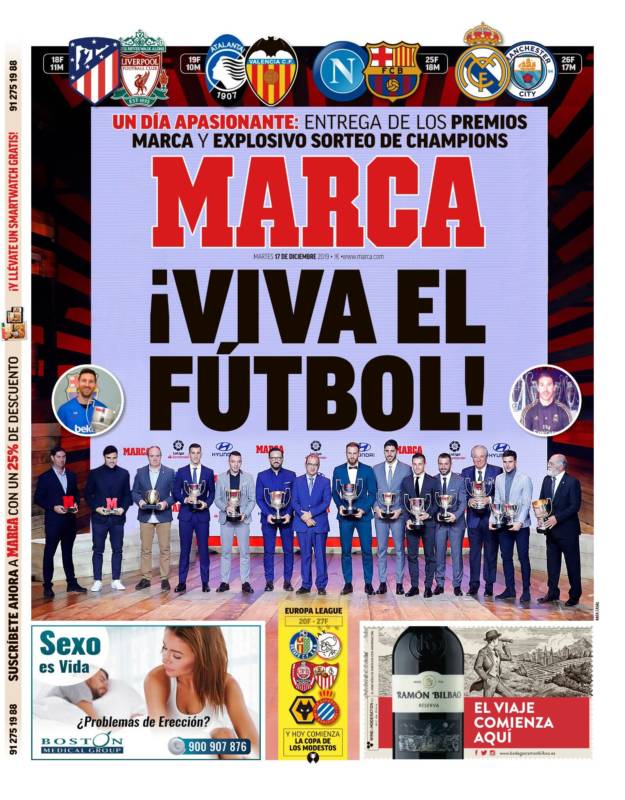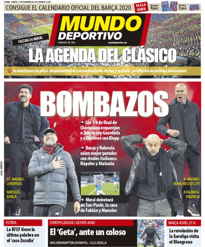 Sí, amigos. Tanto la prensa capitalina como la del país pequeñito de ahí arriba (gracias, Pep, por tantas frases memorables) trae como argumento central del día el resultado del sorteo, resaltando As como veis el emparejamiento entre equipos madrileños con escuadras de la Premier. El Malakito, sin embargo, jugará la ida en Liverpool y la vuelta en Memphis, o la ida en Liverpool y la vuelta en Murcia, dependiendo de cuál de sus dos versiones (la de Tennessee o la hortelana) quiera sacar el Cholo. Esto del Malakito, hilarantemente contado por Mario de las Heras en estas mismas páginas, nos va a dar para no pocas alegrías. Vamos a ver si también se las da a Klopp, o si por el contrario el equipo en transición del pueblo, o del pueblo en transición, el equipo popular-transitivo a fin de cuentas, es capaz de eliminar al campeón de Europa o eso en las transiciones no se lleva.