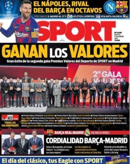 Los otros dos jinetes del Apocalipsis vienen hoy con la entrega de sus correspondientes premios, y qué podemos decir salvo enhorabuena a los galardonados, claro. El Clásico se cuela con todo en la portada de Sport, que resalta en su faldón inferior la cordialidad entre Madrid y Barça en la previa. Al parecer, en medio de todo el conflicto que aún hace peligrar la celebración del choque, ambas expediciones dormirán en el mismo hotel y acudirán juntas al Camp Nou. Si se trata de un gesto que viene del FC Barcelona, y que tiene como objeto tranquilizar al Real Madrid en medio del clima intensamente agresivo y politizado, lo cierto es que nos parece loable. El problema es que ha sido la misma institución, el Barça, la que ha contribuido de manera decisiva a la creación de ese clima agresivo y politizado. Si no lo hubiera hecho, no necesitaría acompañar al Real Madrid a ninguna parte, gracias.