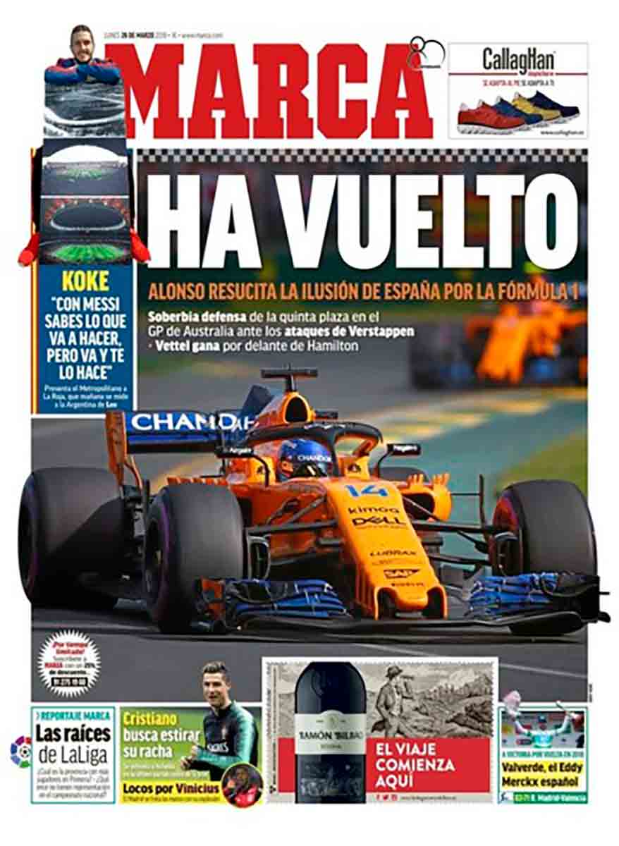 Hoy comienza el Mundial de Fórmula 1, un campeonato arrasado por los Mercedes los últimos ocho años, siete de ellos con título para Lewis Hamilton. La mayor emoción de estos campeonatos consistía en saber con cuántas carreras de antelación se proclamaría campeón el piloto británico. “Vuelve Magic”, reza el titular de Marca, pero al igual que Pepe Kollins nos decía acerca de Messi, que cuando dice que se va, es que ya se ha ido, cuando Marca dice que vuelve Alonso, es que ya volvió con anterioridad:
