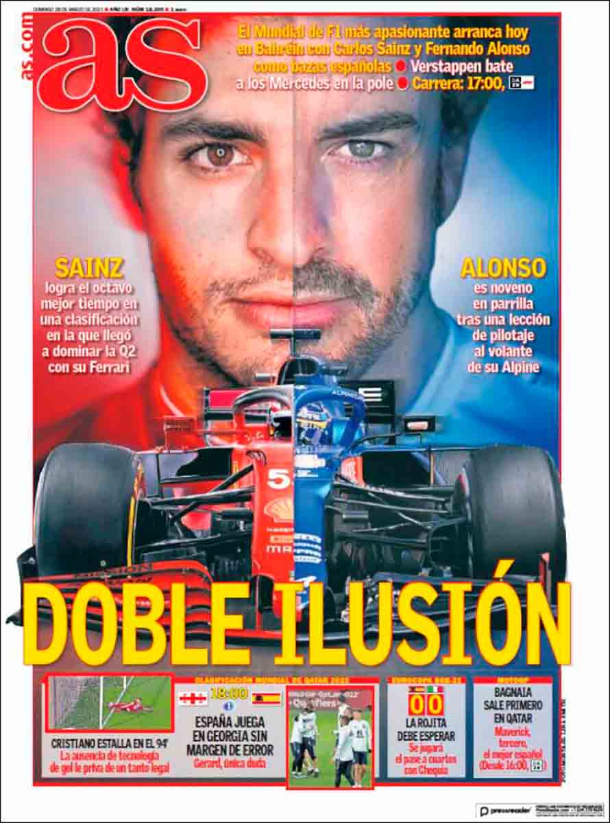 El montaje con las medias caras y los medios bólidos de Carlos Sáinz Jr. y Fernando Alonso nos parecería de gran belleza si no fuera porque las tonalidades se mezclan en un azuloscuro-rojocasigrana que nos repele en todas sus formas y expresiones.