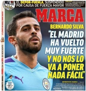 La respuesta está en la portada de Marca en esta mañana asfixiante de julio. No en la entrevista con Bernardo Silva, quien por cierto manifiesta con respeto y buen tino que no ve la eliminatoria que se dirimirá frente al Madrid el 7 de agosto tan de cara para los suyos como se dice (“El Madrid ha vuelto muy fuerte y no nos lo va a poner nada fácil”). No. El tema está en la letra pequeña: “Los blancos no tendrán que pasar la cuarentena impuesta por el Gobierno británico”. Eso es lo que nos hace dudar.
