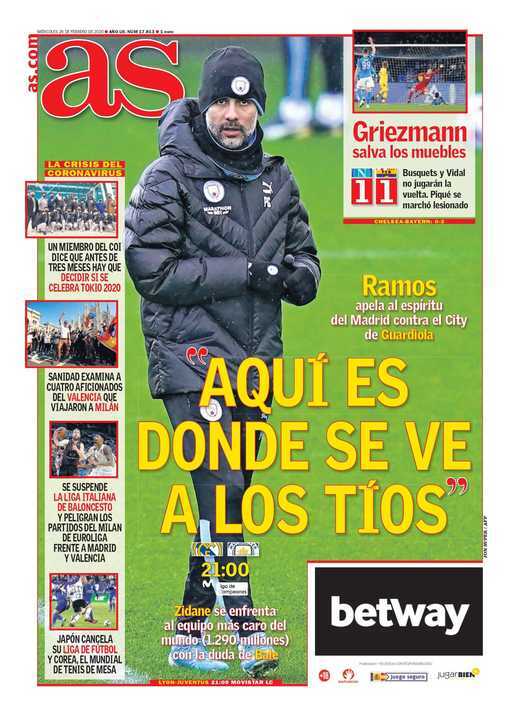 En todo caso poco o nada nos importa lo apuntando en líneas precedentes. Ni siquiera el coronavirus al que As dedica una columna entera de apocalipsis digno de Estallido en su primera plana. As sigue el manual llamando a la prudencia, el rigor y la calma. Periodismo de servicio público lo llaman. No se dan cuenta en la Ouija de que el titular escogido para presidir su portada es el que verdaderamente nos sugiere ajustarnos bien la mascarilla.