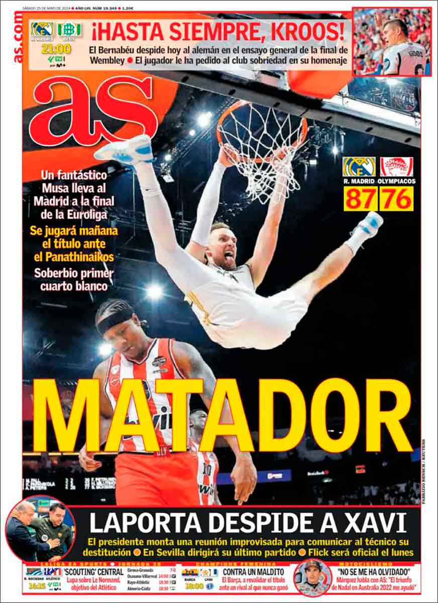 Luego, por supuesto, también subyace una cuestión de estilo. Ninguna de las apuestas de la prensa deportiva mesetaria, fuera por diseño o tipografía, se postula a ser enmarcada en cristalerías Chamberí para la posteridad, salvo que uno tenga, claro, predilección por las posaderas de Dzanan Musa. Las que luce el bosnio en la tapa del diario As no son, por cierto, más que la culminación de un delicioso pase a la remanguillé que sofocó la espartana resistencia a la derrota de los atenienses, siempre joroña que joroña, como aquel viejo spot —que no Sport— de yogures cremosos.