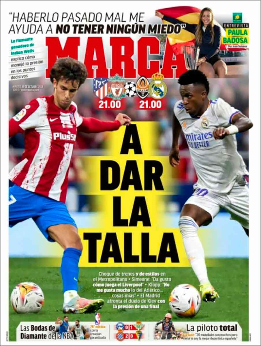 «A dar la talla» es el titular del diario Marca, ilustrado con sendas fotografías de Vinícius y João Félix en referencia a los enfrentamientos de Champions de esta noche tanto de Real Madrid como de Atlético contra el Shakhtar y el Liverpool respectivamente.