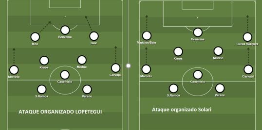 Los cambios no se hicieron esperar y pronto se vio que la hoja de ruta de Solari era bien diferente a la de su predecesor. La primera gran medida fue el paso del 4-3-3, eminentemente interior, que impulsaba Julen a uno, de carácter exterior, en el que la amplitud ya no era tarea de los laterales, sino que doblaba esfuerzos y fijaba muy abiertos a los extremos (Bale y Lucas), encargados de garantizar la simetría posicional del equipo en fase defensiva y tener los carriles siempre ocupados en, al menos, dos alturas.