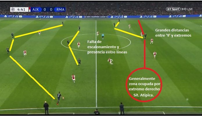 El principal resultado de este nuevo formato es la acumulación de piezas por detrás del balón (defendiendo) o la excesiva lateralización del juego, ensanchando el campo y dando lugar a una situación en la que Benzema es el único elemento con presencia entre líneas y el encargado de ordenar todo el frente de ataque.