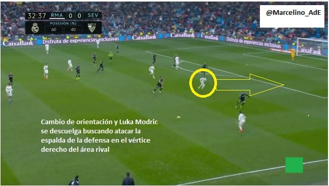 De cara a paliar este déficit, una de las situaciones cuando el juego termina cayendo en los costados y se encuentra el Real con dos jugadores en línea de cal es la proyección de los interiores. En este caso es especialmente destacable el rol de Luka Modric, quien de los dos interiores es el que más profundidad ofrece y no es extraño que dibuje desmarques de ruptura en el pico del área.