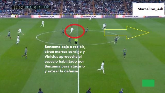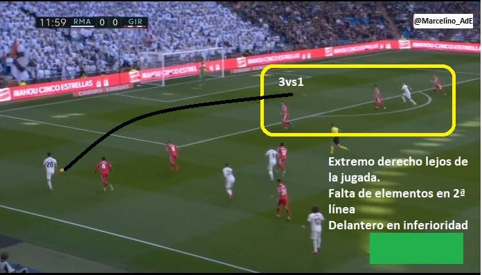 Uno de los principales obstáculos que encuentra el Real Madrid una vez llega a situaciones de ataque posicional es la excesiva amplitud que ofrecen extremos y laterales, prácticamente duplicando posiciones y que suele dar lugar a que sólo Benzema se empareje con los centrales rivales, generando situaciones de inferioridad numérica y careciendo el equipo de efectivos que carguen el área. Si, además, se tiene en cuenta que Benzema no es un futbolista especialmente hábil a la hora de atacar el punto de penalti y que es mejor habilitando esos espacios desde la 2ª línea, da lugar a ataques posicionales excesivamente planos.