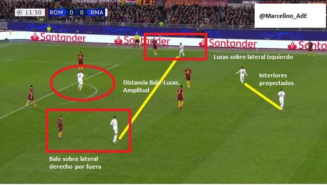 A nivel táctico, no se aprecia que Vinicius reciba consignas diferentes a las que en su momento tenía Bale en izquierda. Su posición de partida sigue siendo eminentemente exterior, es en la línea de cal donde principalmente se desenvuelve y no está exento de las obligaciones defensivas de Bale, tanto él como Lucas deben auxiliar al lateral de su zona y trazar persecuciones hasta campo propio si fuera necesario.