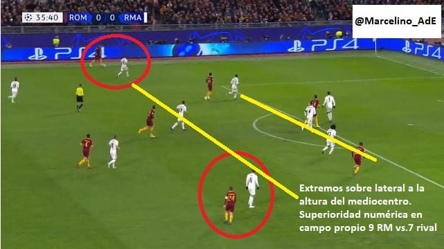 Como decíamos, la verticalidad es un elemento indispensable en el juego del equipo, la velocidad en la circulación y las transiciones es fundamental en los esquemas del entrenador. De ahí que esas bandas siempre estén ocupadas por jugadores con capacidad de recorrido como Lucas Vázquez, Vinicius Jr, Gareth Bale o Marco Asensio. Jugadores que puedan dar ese ida y vuelta defensivo sobre la línea de cal y que además tengan capacidad de conducción para estirar los ataques del equipo y llevar rápidamente el cuero lejos de la portería. Por otra parte, eso también explica la importancia de Benzema en el sistema blanco, dado que se necesita un jugador en el carril central que sea capaz de obtener ventajas con el cuero y catapultar a los compañeros de los flancos.