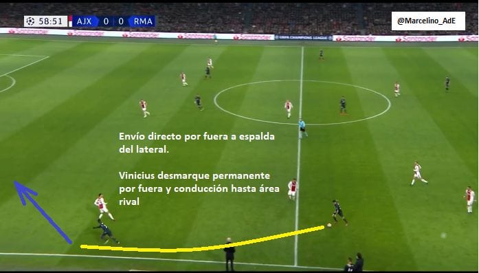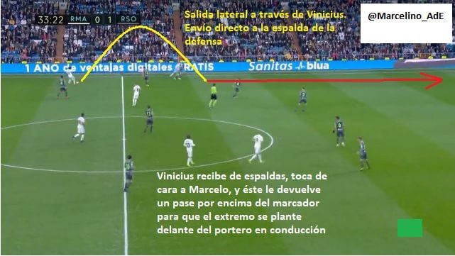 Esa energía de Vinicius da tiempo y espacio para sus compañeros. La jugada típica de Vinicius es el desmarque exterior a la espalda del lateral. Ofrece permanentemente un movimiento profundo y una opción de salida a través de un envío directo para el lateral de su zona (Marcelo o Reguilón). Está siempre bien posicionado para efectuar ese desmarque con su cuerpo ligeramente orientado hacia el arco rival y a partir de ahí su timing y la facilidad con la que alcanza su punta de velocidad le permiten ganar separación.