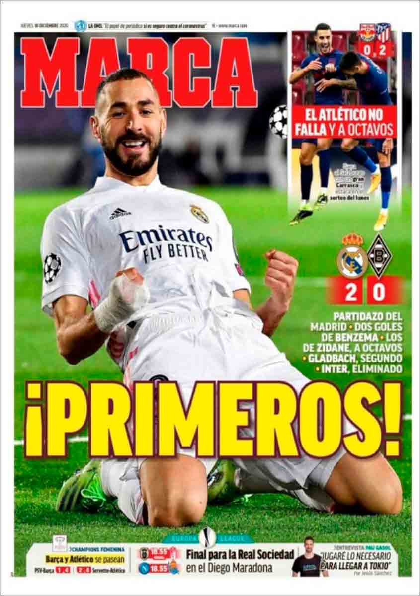 El tratamiento que las portadas cataculés dan a la despampanante victoria del Madrid ante el Gladbach representa la más fiel imagen del cicaterismo al que puede llevar la envidia teñida de fobia, y para qué ocultar que ello nos da un poquito de risa, amics. “El Real Madrid gana y pasa como primero”, dice telegráficamente Sport, en un recuadrito que conviene buscar con lupa (lo de que conviene es un decir). Pero lo realmente risible es lo de Mundo Deportivo: “Benzema saca del lío a los blancos”, dando a entender un partido del Madrid que en nada se parece a la exhibición que en realidad vimos. No, estimados, Benzema no sacó al Madrid de ningún lío, sino que rubricó con sendos cabezazos el triunfo de un gran fútbol, el mismo que reedita ahora la peor de vuestras pesadillas recurrentes.