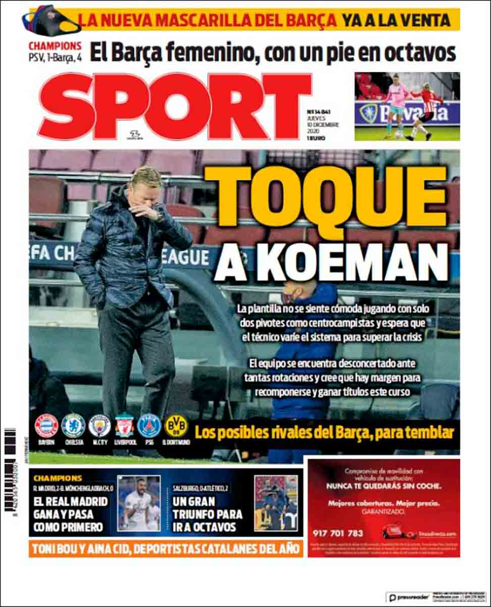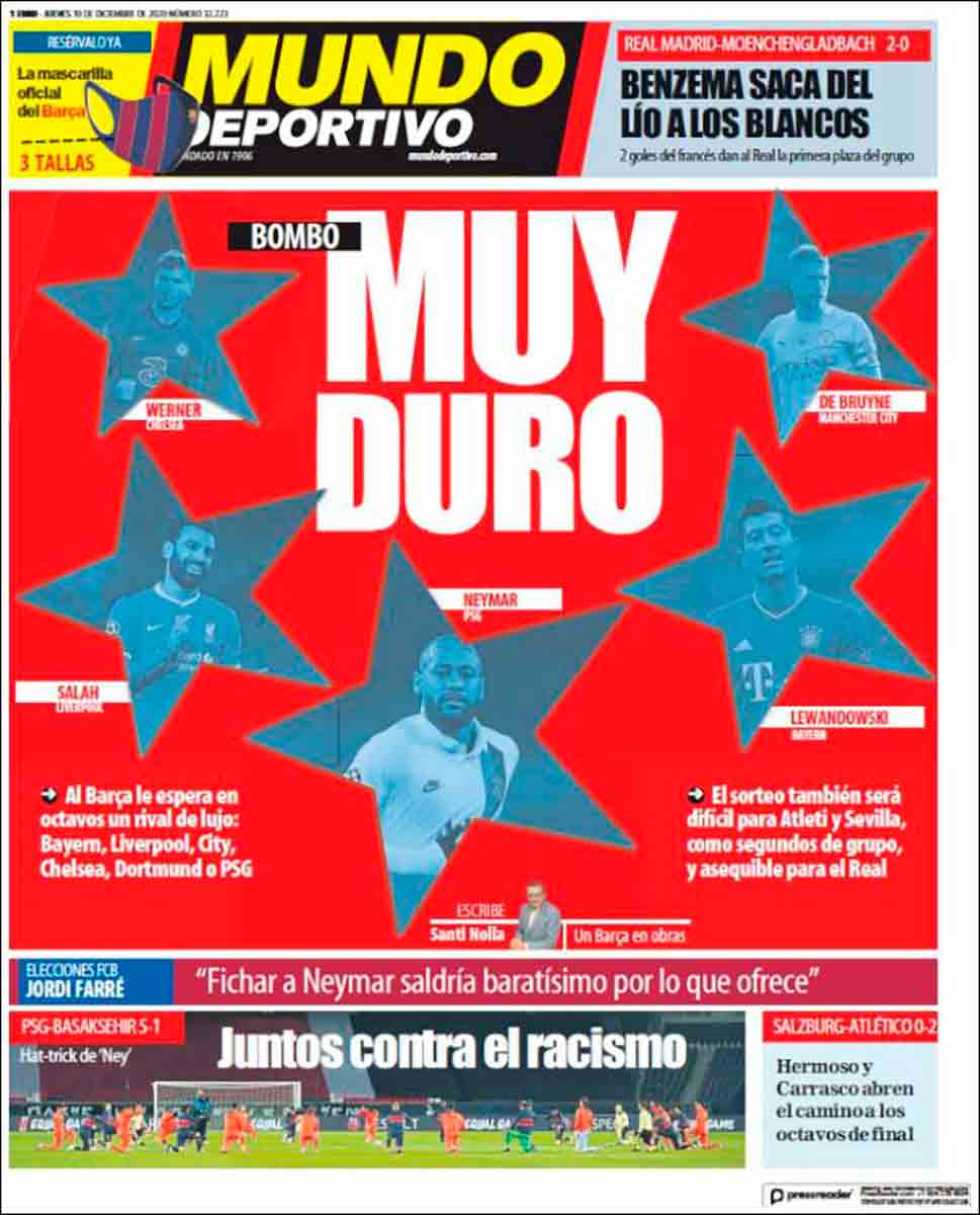 En la otra orilla, en cambio, todo son lamentos ante el muy espinoso sorteo de Octavos que se le ha quedado al Barça tras la sonora goleada encajada (encima) ante cierto portugués de infausto recuerdo. Pasan los de Koeman como segundos de grupo y en el bombo les espera una bonita colección de cocos. “Muy duro”, se lamenta Mundo Deportivo, y es verdad. La relación de posibles rivales contrasta con la relativamente asequible que tiene el Madrid: Chelsea, City, Dortmund, Liverpool, PSG... y Bayern de Munich, equipo que tendría gracia para Octavos siendo como es Octavo el ordinal de 8.