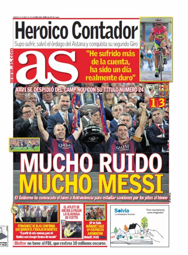 La portada de As es más variopinta e introduce elementos ajenos a la final de Copa de anoche, con mención especial para el notable trabajo de Alberto Contador en el Giro de Italia, también -seamos justos- apuntado por Marca. En todo caso, como no podía ser de otro modo, el asunto central sigue siendo el Athletic-Barcelona de ayer. Y aquí As avisa de posibles sanciones por los pitos, destaca a Messi en su titular como protagonista de la final y, sobre todo, presenta una foto limpia y pulcra, tan aseada que huele demasiado a lejía. Hubo pitos, sí, y muchos; hubo banderas y pancartas, que -cómo decirlo- podrían ser consideradas desafiantes e incoherentes con las ganas de celebrar el trofeo copero español, pero tenemos una foto en la que salen dos héroes de la Roja, levantando la Copa, ante un sonriente Felipe VI y un pletórico Artur Mas. "Esa es la foto, muchachos", dijo tal vez alguien en As, "esa es la España que queremos", aunque tal vez no sea la que tengamos, ni la que quedó retratada anoche. Pero, ya saben, no dejes que la realidad te estropee una buena historia. Qué ternura.