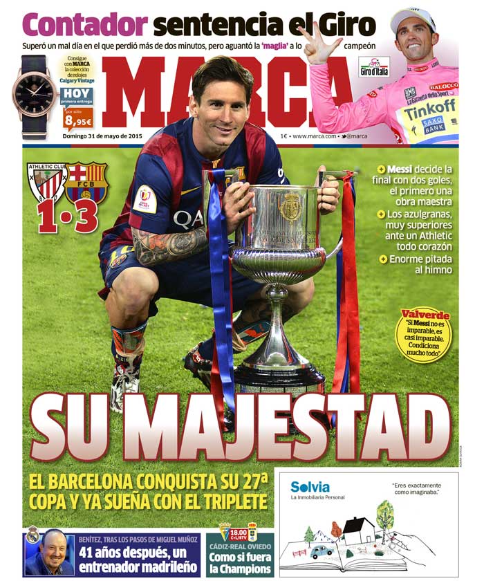 "Enorme pitada al himno", reseña Marca de modo claro y rotundo, sin ambages ni complejos, como quien luego, en destacado titular, no se atrevería a nombrar a Messi "SU MAJESTAD", pero resulta que se atreve. Creemos obvio que tal tratamiento obedece, sobre todo, al gran gol que marcó anoche el argentino, pero no dejamos de ver un chascarrillo implícito, tan brillante que roza todo lo contrario de la brillantez. Que las aficiones pitaron el himno de un país, cuyo jefe de estado es rey y estaba presente en la pitada, pues nada, llamemos "SU MAJESTAD" a la principal figura del partido y verás tú qué risas de Artur Mas al comprar el periódico. La cosa es tan juguetona y tal vez perversa, que Marca parece incluso querer compensar su inconveniencia en el recuadro inferior izquierdo de su portada. Allí aparece Rafa Benítez, protagonista de una noticia de altura, de una exclusiva que hará temblar los cimientos del fútbol actual: tras 41 años, un madrileño podría volver a entrenar al Madrid. Las mocitas de nuestro himno estarán encantadas de saberlo, pero nos atrevemos a afirmar que el madridismo no ha pitado a ningún entrenador por no ser madrileño.
