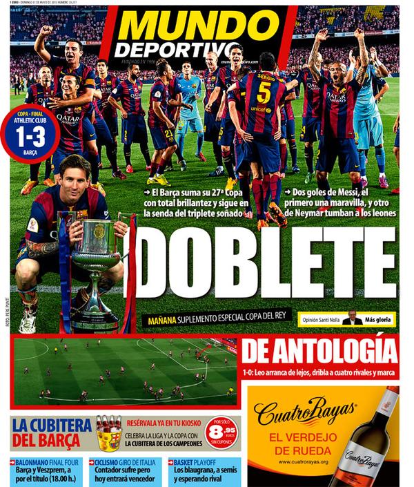 En el fondo tal vez tengamos que estar agradecidos al As por hermanarnos con su candidez, y también a Mundo Deportivo. Es verdad que, viendo su portada, no pareció haber incidente alguno relacionado con el himno español, pero no es menos cierto que, al menos, tampoco hubo comprensible reivindicación identitaria, ni lógica afirmación del terruño, ni nada que pueda caracterizarse de político. Para Mundo Deportivo hubo "doblete" y nada más. Y de verdad que lo agradecemos, aunque sea mentira. ¿Quién dijo que la prensa debía reseñar los hechos tal y como acontecieron? ¿Qué son en realidad los hechos? Si lo pensamos bien, Mundo Deportivo nos está confrontando con los límites de nuestro acceso al conocimiento. Mundo Deportivo nos está haciendo pensar, y eso no se paga con dinero. Así que adquieran ya de una vez la cubitera del Barça, por el módico precio de 8'95. ¿Qué más quieren?