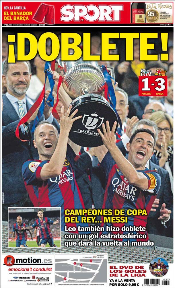 Tampoco hubo pitos al himno para Sport, por lo cual extendemos nuestra gratitud a este periódico por invitarnos también a reflexionar sobre la borrosa frontera que hay entre la realidad y la ficción. En plena coherencia con esta (sospechosa) asepsia y en confluencia con As, la foto elegida para la portada también muestra a los maestros del tiki-taka, Xavi e Iniesta, levantando la Copa ante el Rey de España. Se rumorea que Walt Disney ya ha comprado los derechos de este hermoso cuento de hadas, donde -como ocurría en Marca- Messi será el rey. Pero la película promete ser tensa, porque aquí hay dos reyes, uno ultrajado y el otro ensalzado. Como no sabemos si confiar en los guionistas, optemos por centrarnos en la lírica del subtítulo que nos ofrece Sport, acaso ideal para una prueba de comentario de texto en un examen de ingreso a la universidad. A saber: "Leo también hizo doblete con un gol estratosférico que dará la vuelta al mundo". Impresionante. Qué bello juego entre "mundo" y "estratosfera", aunque solo sea porque la estratosfera está en el mundo y tal, y es una de las capas de la atmósfera, que se subdivide a su vez en varias capas y eso; más o menos como la realidad, que está formada por hechos que podemos ver o no, e interpretar según convenga, porque anoche, como todo el mundo sabe, hubo fútbol y solo fútbol, aunque ustedes también hayan visto todo lo contrario.