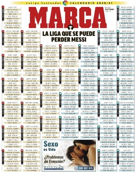 No sabemos si el único anuncio que aparece en la portada de Marca estará relacionado con que a muchos miembros de este establishment no les excite la salida precoz del argentino y estén deseando que dé marcha atrás. Aunque a la pregunta que plantea la publicidad de la portada, Bartomeu ha dicho que no tienen problemas de elecciones, porque estas serán en la primavera, que la sangre altera, de 2021. Lo que no está claro es si se refiere a que no tendrán ninguna elección hasta esa fecha o los meses restantes serán una continua campaña de priapismo electoral. El agujero que deja Leo en el Barça es grande y será difícil consolar a una afición viuda de su principal sujeto de placer futbolístico que llora mientras lee las esquelas del Marca y procede a quitarse la liga con la que pretendía seducir al jugador argentino para que no se marchase de su lado. Luto nacional.