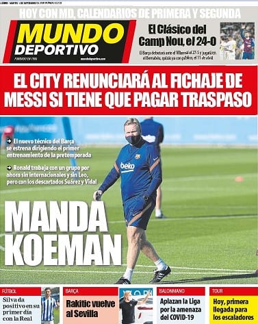 En Mundo Deportivo, Koeman nos mira con los ojos entornados por el sol mientras camina por un entorno desolado. El primer entrenamiento del Barcelona a las órdenes del holandés con Suárez y Vidal aún ejercitándose con el equipo ha debido de ser la alegría de la huerta. No descartamos que los dos jugadores americanos hayan saltado al campo con sus móviles para tuitear apoyos a Messi y puyas al Barça entre carrera y carrera y flexión y abdominal.