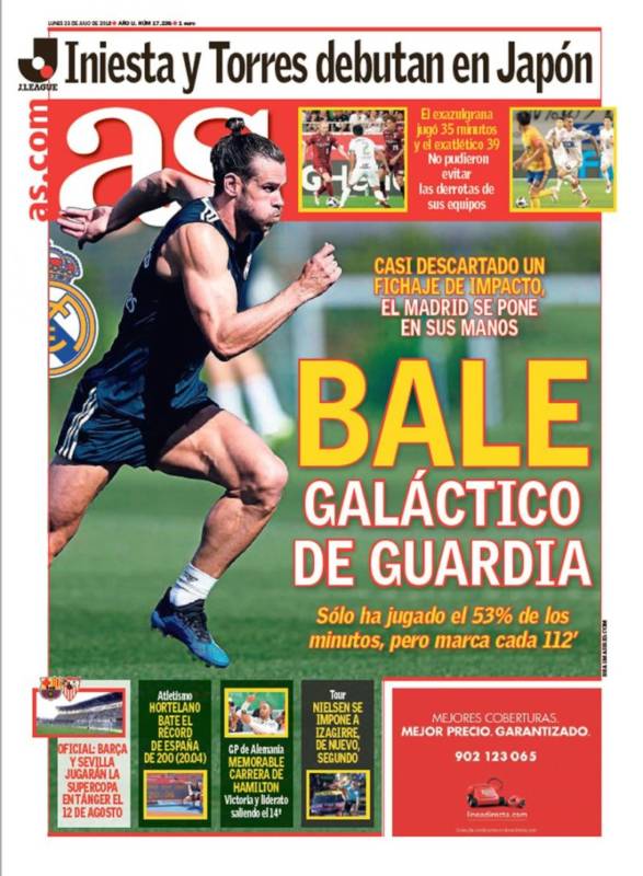 La palma se la lleva, como casi siempre, la portada de 'La Ouija Today'. Si ayer era Benzema el hombre al que se agarraba Lopetegui, hoy es Bale el "galáctico de guardia" al que se agarra todo el Real Madrid. Cada día le toca a uno. No descartamos que antes de que acabe el mes sea Isco el que ocupe esa portada con un titular semejante al que han protagonizado sus dos compañeros. Relaño es tan previsible...