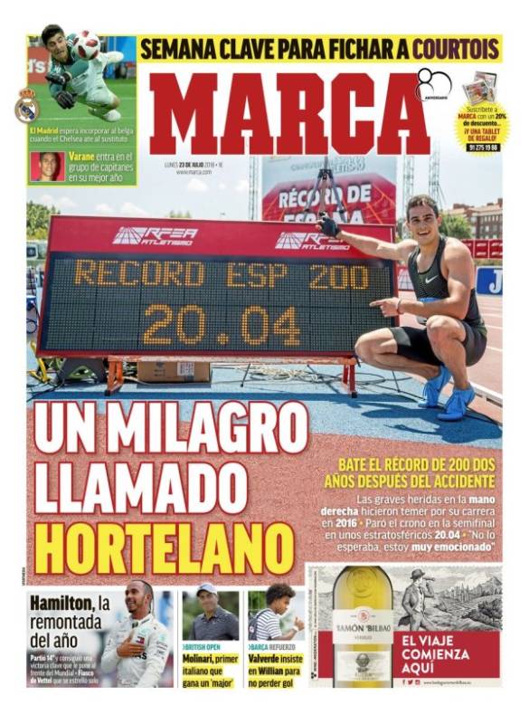 En cuanto a las portadas, semana clave para fichar a Courtois -esto nos recuerda al tan manido "cuestión de horas" que nos persigue cada verano-, Valverde empieza a confeccionar su plantilla -menos canteranos que nunca- y el Barcelona apretará por Willian, que es un brasileño nacido en Lloret de Mar.