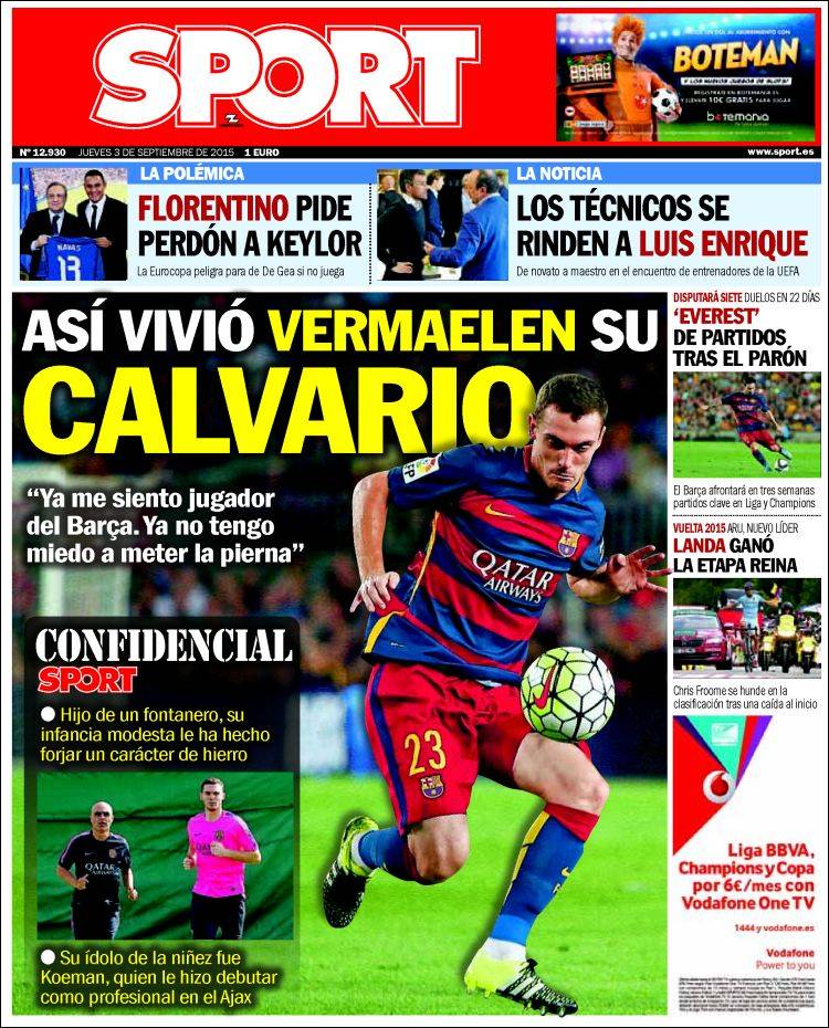 Poco que decir sobre la portada de Sport, salvo alegrarnos por la recuperación de Vermaelen y abstenernos de comentarios chuscos sobre la larga baja sufrida por el central.