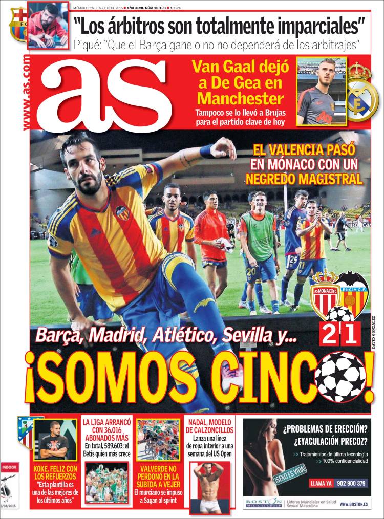 "Somos cinco", titula ufano As para nuestro desconcierto inicial. ¿Qué cinco?, nos preguntamos instintivamente y antes de un somero repaso general a la gente que nos rodea (en este momento, solo vemos cerca al Padre Suances, que ha pasado por la redacción para dejar junto a cada ordenador un rosario impregnado de indulgencias plenarias que sin duda nos ayudará a arrostrar las consecuencias de las blasfemias en que incurrimos durante la confección de esta sección. El resto de colaboradores aún no parece darse cuenta de que agosto ha finalizado y se impone un pronto retorno al tajo).