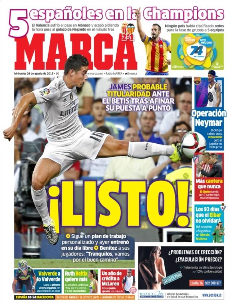 Marca, por su parte, se centra en la presumible vuelta a la titularidad de James. En La Galerna adoramos a James, si bien adoramos aún más el hecho de que Rafa Benítez pueda disponer sobre el campo el once que estime oportuno en función del esquema necesario para el partido en sí y del estado de forma de sus jugadores, lo que desde luego incluye, si es preciso y aunque nos duela, el que James ocupe inicialmente un puesto en el banquillo cuando (otra vez) el entrenador lo considere oportuno. Nos gusta James, pero nos gusta aún más la independencia del entrenador respecto a los designios de la prensa.