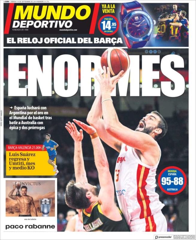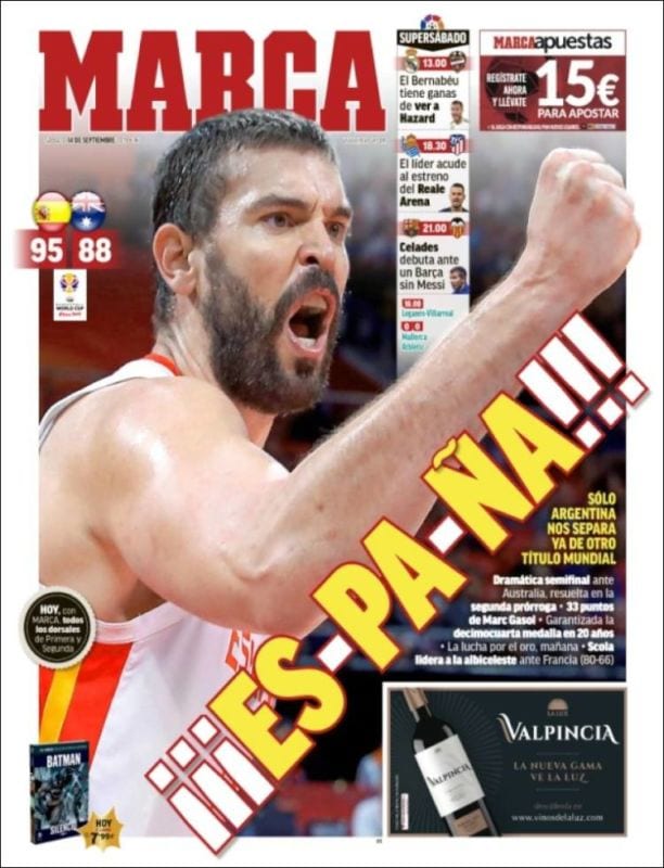 Canta que da gusto la diferencia formal entre Sport y el resto. Por nosotros no va a quedar el elogio eterno a esta selección, llena de calidad, de arrojo, de insistencia, de tesón competitivo... de todo aquello que hace falta para haberse plantado en otra final tras dos prórrogas contra la muy eficiente (y pesada) Australia, con capítulo aparte para Marc Gasol. Ahora, mañana, tocará enfrentarse a la Argentina de Gabriel Deck, Facu Campazzo, Laprovittola (¿los conocen?) y un tal Luis Scola, joven promesa albiceleste que está sin equipo, Florentino. Promete ser un espectáculo de primera magnitud, a la sazón, lleno de jugadores madridistas en ambos equipos.