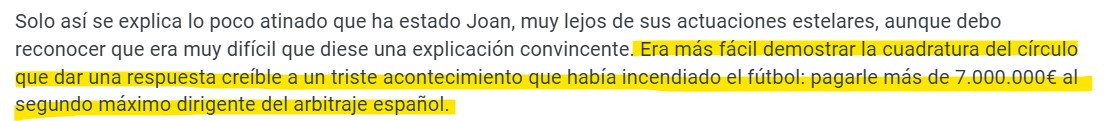 7.3 millones pagados al 2 de los árbitros durante al menos 17 años, con 4-5 directivas distintas, y justo hasta que fue cesado del CTA. Es imposible encontrar una justificación legal para la intención de los pagos. Sólo cabe una intención para dichos pagos salvo que pensemos que todos los directivos que sabían del negociado negreiril eran tan tontos de escamotear dinero al club usando al 2 de los árbitros con el gran riesgo añadido de que si les pillan su amado Barça es descendido. ¿Quién en su sano juicio se iba a jugar literalmente la vida poniendo al club al borde de ese precipicio durante posiblemente un cuarto de siglo por unas decenas de miles al año, pudiendo usar a cualquier otro proveedor sin este riesgo añadido? ¿Y justo paran de hacerlo cuando cesan a Negreira y desaparece dicho riesgo del descenso para el club? Tontos no, gilipuertas. O más. Así consideró Laporta a todos.