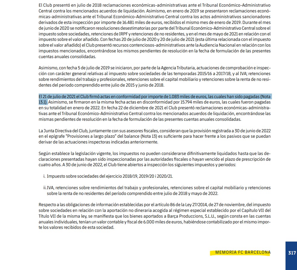 El 5 de julio de 2019 la AEAT inició las actuaciones inspectoras al Barça por el Impuesto de Sociedades 2015/16/17/18 e IVA 2015/16/17 por los pagos efectuados en base a las facturas giradas por NISDAL SCP y DASNIL 95 SL, sociedades de Enríquez Negreira. Tras 2 años de inspección, y casualmente 3 días después de que prescribieran deportivamente, el 21 de julio de 2021, con Laporta de presidente y 21 meses antes de la esperpéntica rueda de prensa, el Barça firmó 2 actas de conformidad por no haber sido capaz de justificar con un mísero documento los trabajos realizados por Enríquez Negreira para esos pagos. Uno por el que pagaron un total de 456.574,26€ por Impuesto de Sociedades y otro por un total de 558.041.65€ por IVA. Pese a haber pagado un millón por las facturas por los pagos a Enríquez Negreira, no se tiene constancia de que Laporta sintiera algo parecido a tener vergüenza al decir que “todas estas facturas han pasado las revisiones fiscales pertinentes”. Hay que valer…
