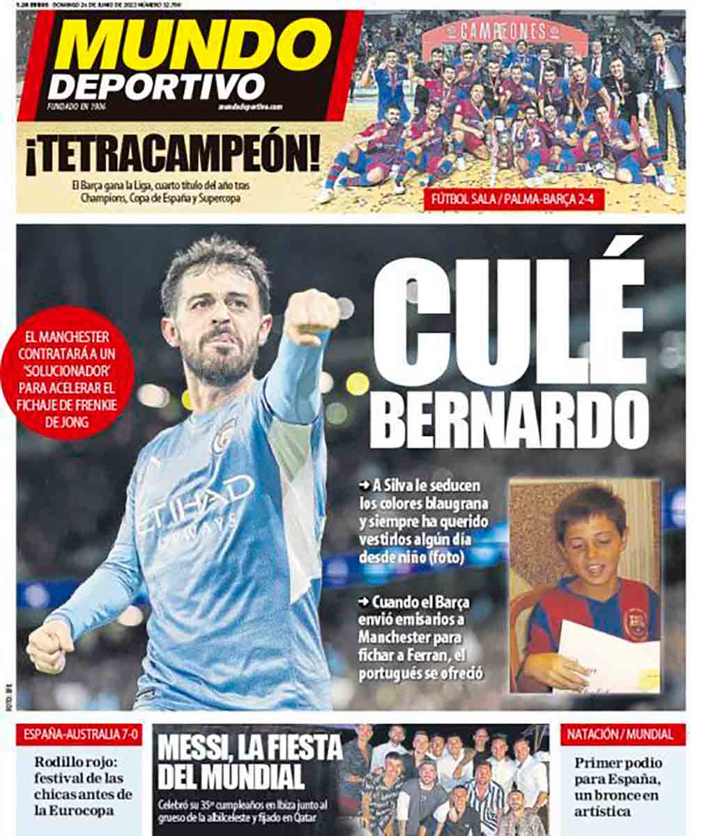 Mundo Deportivo opta para su frontispicio por una fotografía de Bernardo Silva con cara de estar siendo operado de apendi City sin anestesia. Y como todo futuro fichaje, tienen que hacer ver a sus acólitos que el tipo en cuestión ha sido culé desde el mismo momento de su concepción. Que si vestido con la camiseta del Barça, que si cuando fueron a por Ferran Bernardo agarró del brazo al señor del Barcelona que acudió a Manchester y le rogó que le llevara con él… En fin, lo de siempre.