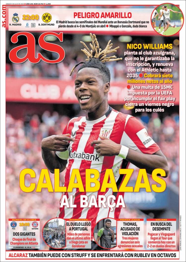 La portada de As da en la diana al hablar de las garantías de inscripción (o de la falta de las mismas) para explicar la decisión final del excelente punta vasco. Vistas las angustias de jugadores como Olmo el verano pasado, Nico y su representante exigían unas mínimas garantías de que el fichaje no comportaría ese suspense. La respuesta de la envilecida entidad catalana ha sido patética y mezquina, como la práctica totalidad de lo que hacen.