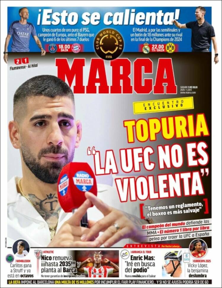 Por su parte Marca, hoja parroquial del Padre Tebas, evita la tentación, pues quien lo hace evita el pecado, queridos niños, y prefiere a Topuria como elemento central de su primera plana. Tebas quería que Nico Williams fichara por el culerío, y lo de la sanción por el Fair Play no le interesa que se sepa, de manera que para encontrar lo primero en la portada marquista hay que usar una lupa como la de Peter Cushing en Top Secret, y para hallar alguna referencia a lo segundo hay que valerse de un microscopio preparado para desagregar átomos como quien prepara unos huevos con chorizo junto a Jan.