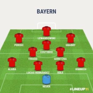 - Mi alineación ideal: Neuer. Kimmich. Sule. Lucas H. Alaba. Thiago. Goretzka. Gnabry. Coutinho. Perisic. Lewandowski.