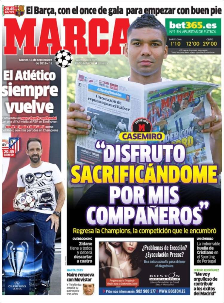 Buenos días. Marca trae hoy en portada la fotografía de su entrevista estrella del día y probablemente del mes: el incomparable Casemiro. Lo saca en primera plana leyendo el Marca, que es una forma razonable de marcar paquete si eres el Marca pero es también práctica que siempre nos ha parecido algo siniestra en el periodismo deportivo. Nos remite a la imagen de esos secuestrados cuya foto se hace llegar a la familia y/o a la opinión pública con el periódico del día como prueba de que siguen vivos. Claro que en el caso que nos ocupa no hablamos de ningún secuestrado sino del secuestrador por excelencia: el hombre que rapta el balón y si se nos apura esconde también a todos y cada uno de los componentes del medio campo rival (sean quienes sean, sean cuantos sean) en un figurado zulo de impotencia del que emergen meses después con una cara parecida a la de Juanfran, que comparte portada con Casemiro porque hoy juega también el Atleti y esa es cosa que merece respeto por parte del diario madrileño, secuestrado a su vez (ya menos, pero secuestrado aún) por su propio afán -o necesidad- de ser el diario de todos o casi todos.
