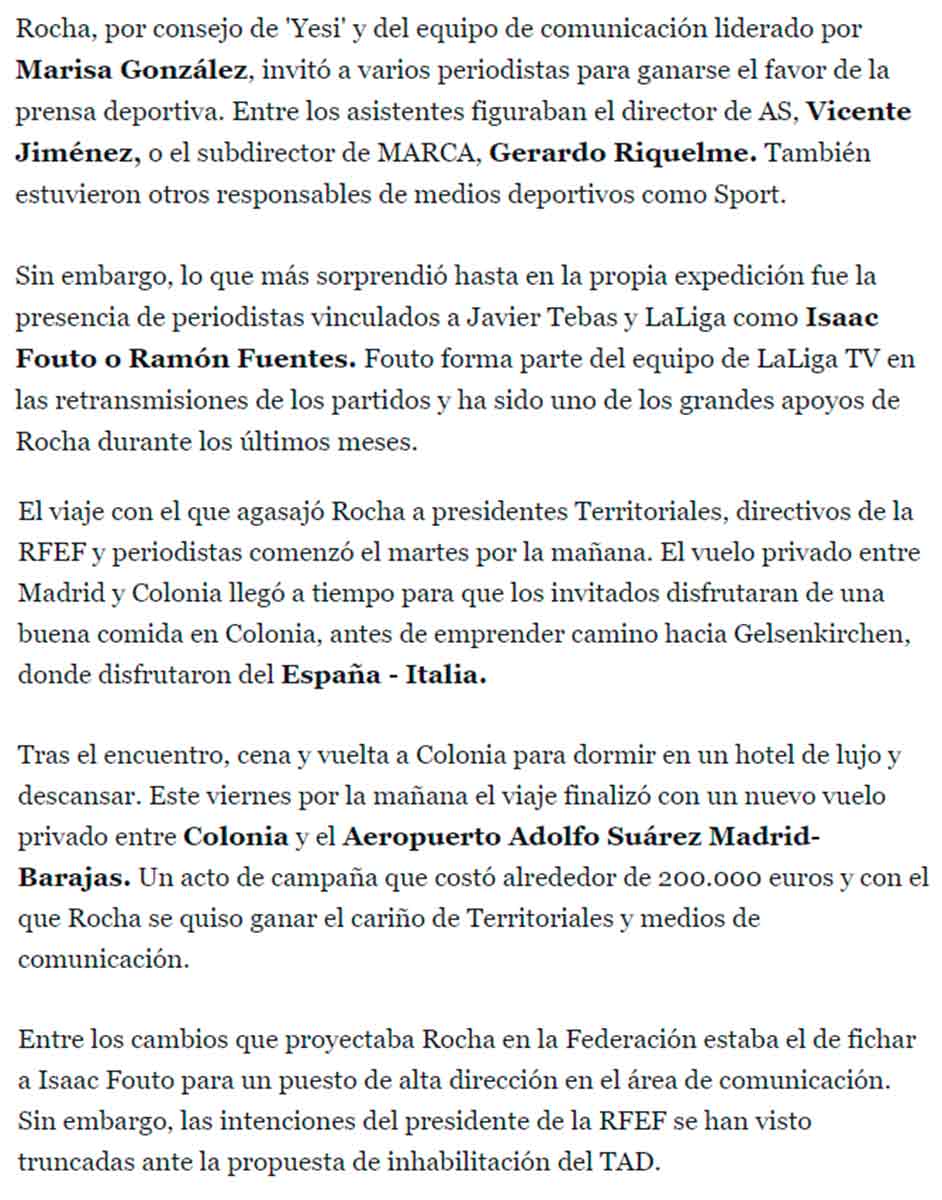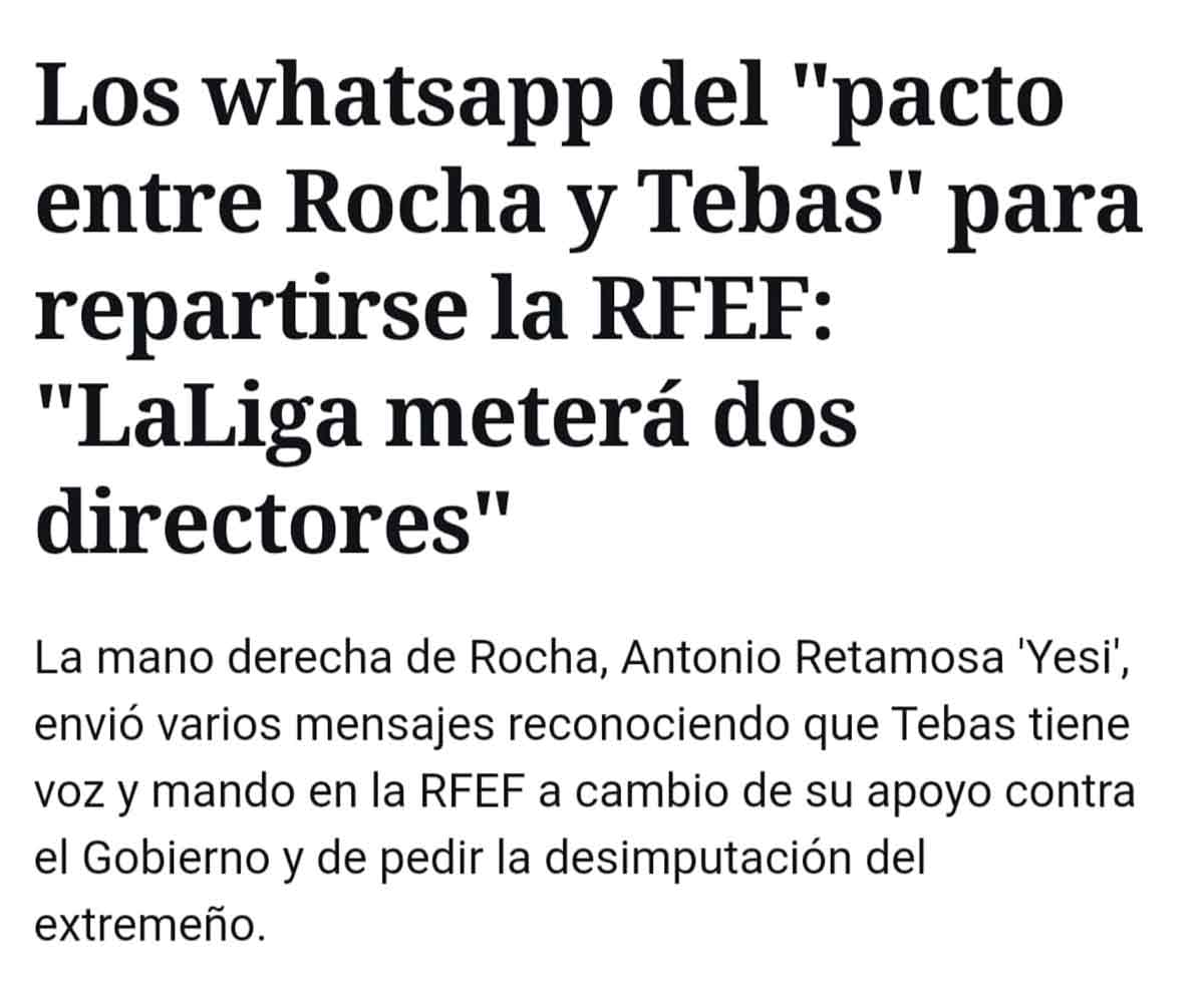 La alianza entre Tebas y Rocha, a quien el primero protege de una defenestración por parte del CSD, no es cosa que nos hayamos inventado nosotros. El Español publicaba ayer la confesión (también por WhatsApp, atención, y seguro que desde el baño) de la mano derecha de Rocha. La pinza está ahí.