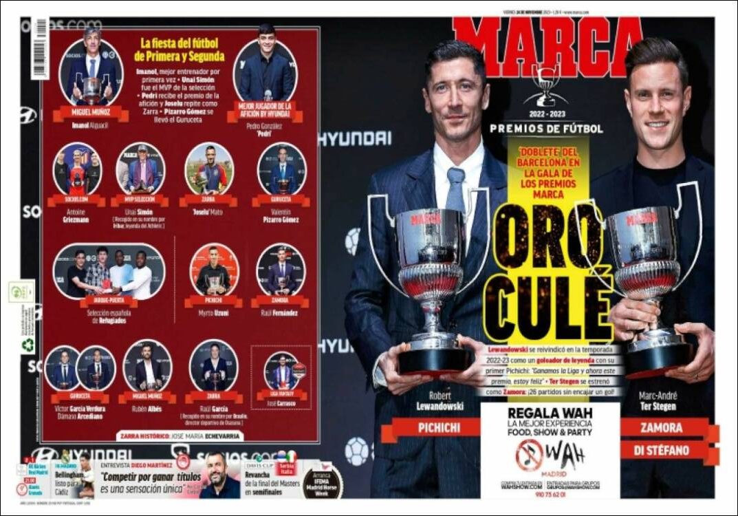 Nos parece legítimo que Marca premie a quien le parezca oportuno. Lo que no nos parece razonable es que, después de ver esta lista de premiados, quede una sola persona en el planeta que pueda acusar a Marca de manifestar una tendencia favorable al club blanco. “Oro culé”, reza extática la portada, por si quedaba alguna duda de por dónde van los tiros.