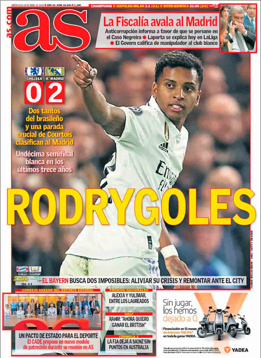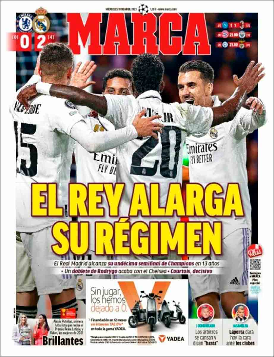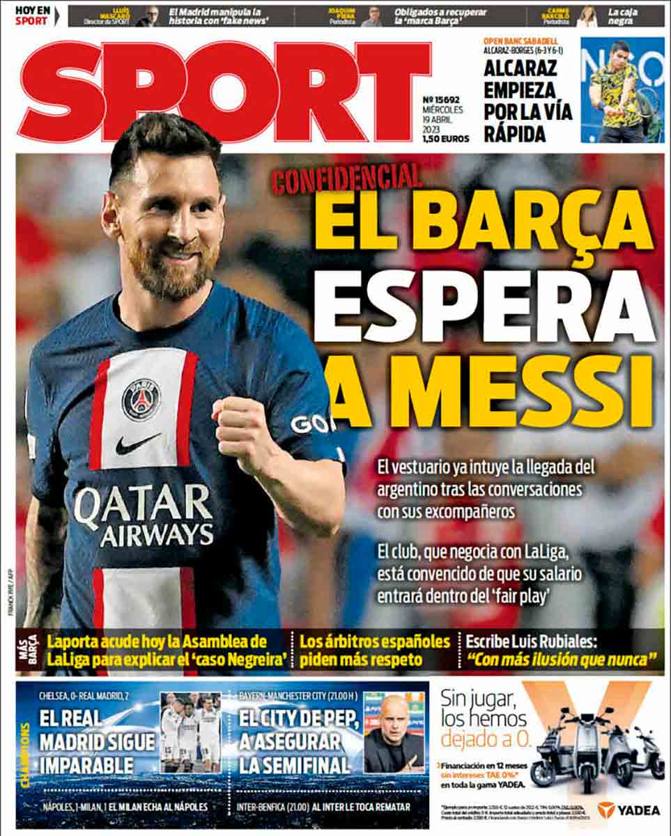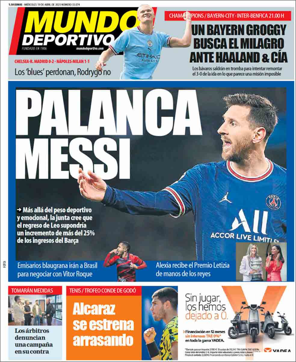 Arriba hay un espacio dedicado al Bayern-City de esta noche, ¿no? Bueno, pues si os fijáis bien veréis, a la altura del antebrazo derecho de Haaland, en letra ínfima y en un color inapreciable, no ya el resultado del Madrid contra el Chelsea sino también el del Nápoles con el Milan para ver si, poniendo los marcadores de dos en dos, logran despistar un poco y que el lector, a quien no solo toman por imbécil redomado sino también por desinformado patológico, se distraiga y no caiga en la cuenta de que el Madrid vuelve a estar en semifinales de Champions. Ampliando la imagen hasta donde dé vuestro smartphone o iPad, tal vez seáis capaces de otear las letras que os decimos y de constatar que, de manera casi indistinguible, en un color cobrizo tan poco atractivo como es posible, aparece el resultado del Madrid, bien es cierto que acompañado del del Milan para que no llame nada la atención. Eso sí, Messi en grande para seguir dando opio al pueblo tras la brutal hecatombe del elefante laportiano en medio de la habitación donde tuvo lugar la rueda de prensa más infausta de la historia del FC Barcelona.