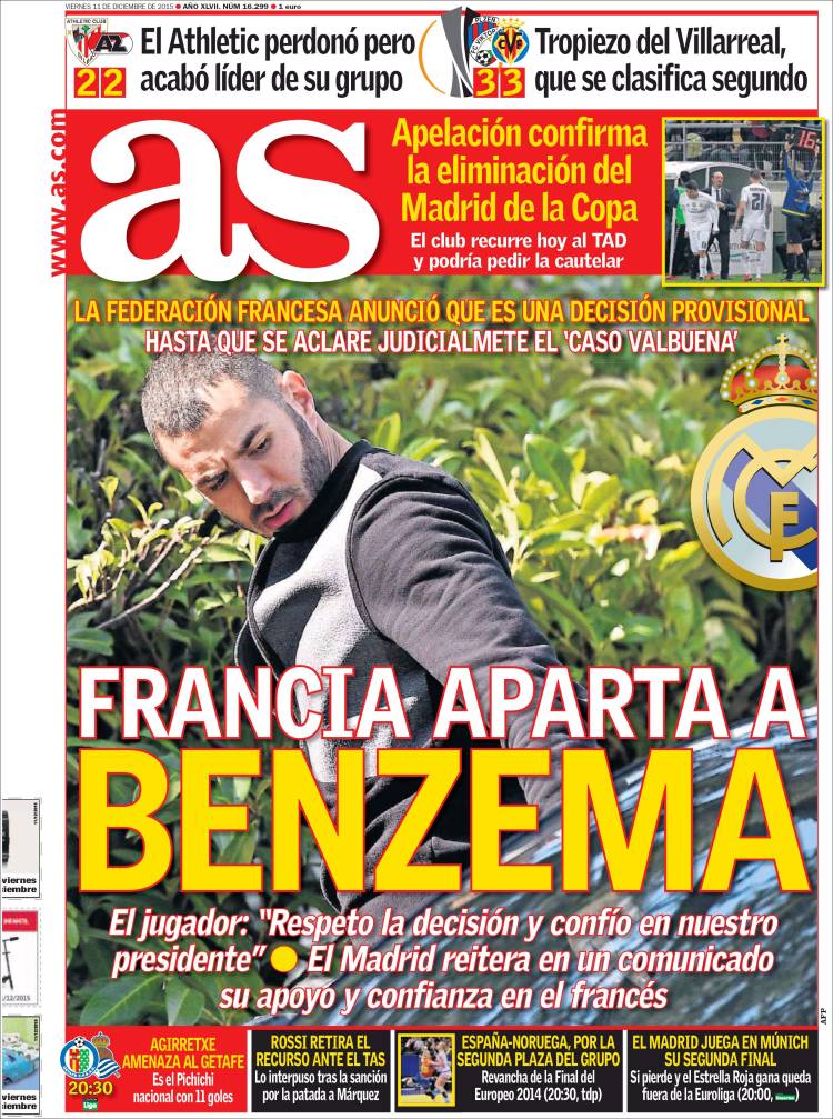 Ayer encajábamos dos nuevas malas noticias pero aquí seguimos como el granítico Marvin Hagler, el boxeador que jamás beso la lona a lo largo de toda su carrera. La Federación Francesa de Fútbol decidió apartar provisionalmente a Benzema de la selección hasta que se resuelva su situación judicial tras el caso de presunto chantaje a Valbuena. ¿Adivinan quién ha dedicado a tan escabroso asunto una portada en la que el tema tiene tal preponderancia que apenas caben ya ni los breves?