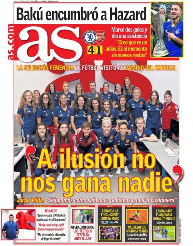También As trae a Ronaldo y a Hazard a portada, aunque les otorgue un espacio menor en relación al que regala a la selección española de fútbol femenino, que también pasó por la redacción de As, no sabemos si a la misma hora que el Fenómeno aunque nos gustaría pensar que sí por el previsible alarde de gentileza y sanos requiebros del encuentro. Seguro que a ellas les haría (o habría hecho) ilusión. Desde La Galerna nos sumamos a los buenos deseos para la selección. Juegan como los ángeles y confiamos en que dejarán el pabellón altísimo.