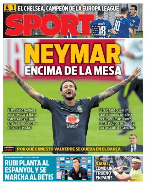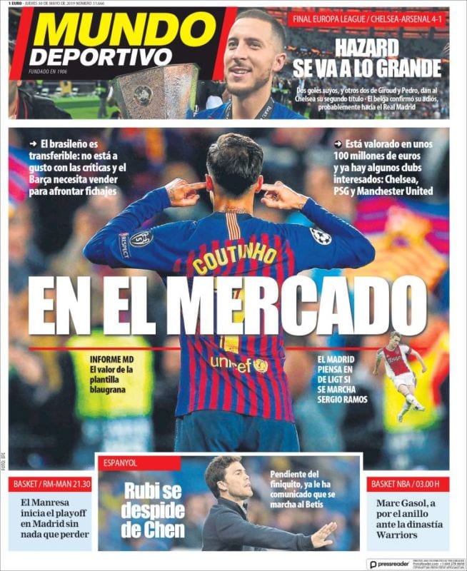 Lo desternillante del asunto es que Neymar viene a la portada de Sport porque alguna foto hay que poner, básicamente, ya que luego, si uno lee los destacados, queda con la clara impresión de que se trata de una hipótesis altísimamente inviable: malas relaciones con el PSG, alto salario, fea salida del club en su momento. No va a ser, y si no va a ser será legitimo preguntarse qué carajo hace Neymar en la portada de Sport. El que sí procede que venga a la portada de Mundo Deportivo, en cambio, es Coutinho, que se va a marchar del Barça con un fracaso sin paliativos a sus espaldas y después de haber costado 170 millones de euros y teniendo que irse ahora por unos 100. Si eso sucede en el Real Madrid, queridos amigos, Florentino tiene que disculparse ante el planeta tierra, en horario de máxima audiencia y en uno de esos programas en los que tienes que tocar miriadas de lombrices con los ojos tapados entre los gritos de asco del público.