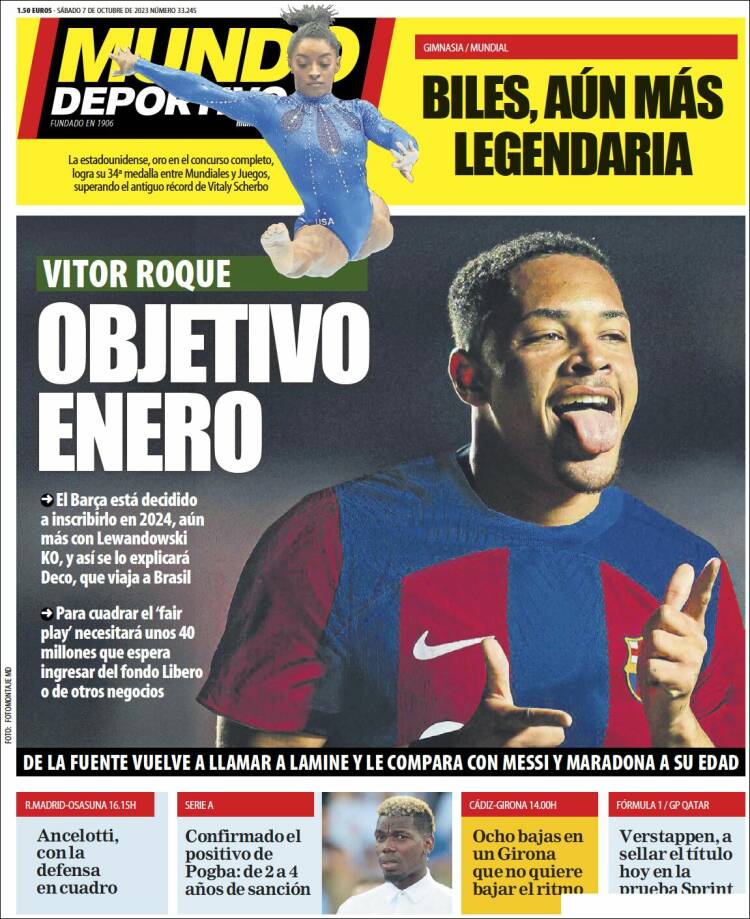 Mundo Deportivo viene con Vítor Roque, su nuevo delantero, que quieren (y seguro que consiguen) inscribir en enero, pero no especifica quién es su nuevo Negreira, aunque todos lo imaginemos (“Puedo ayudaros con el VAR”).