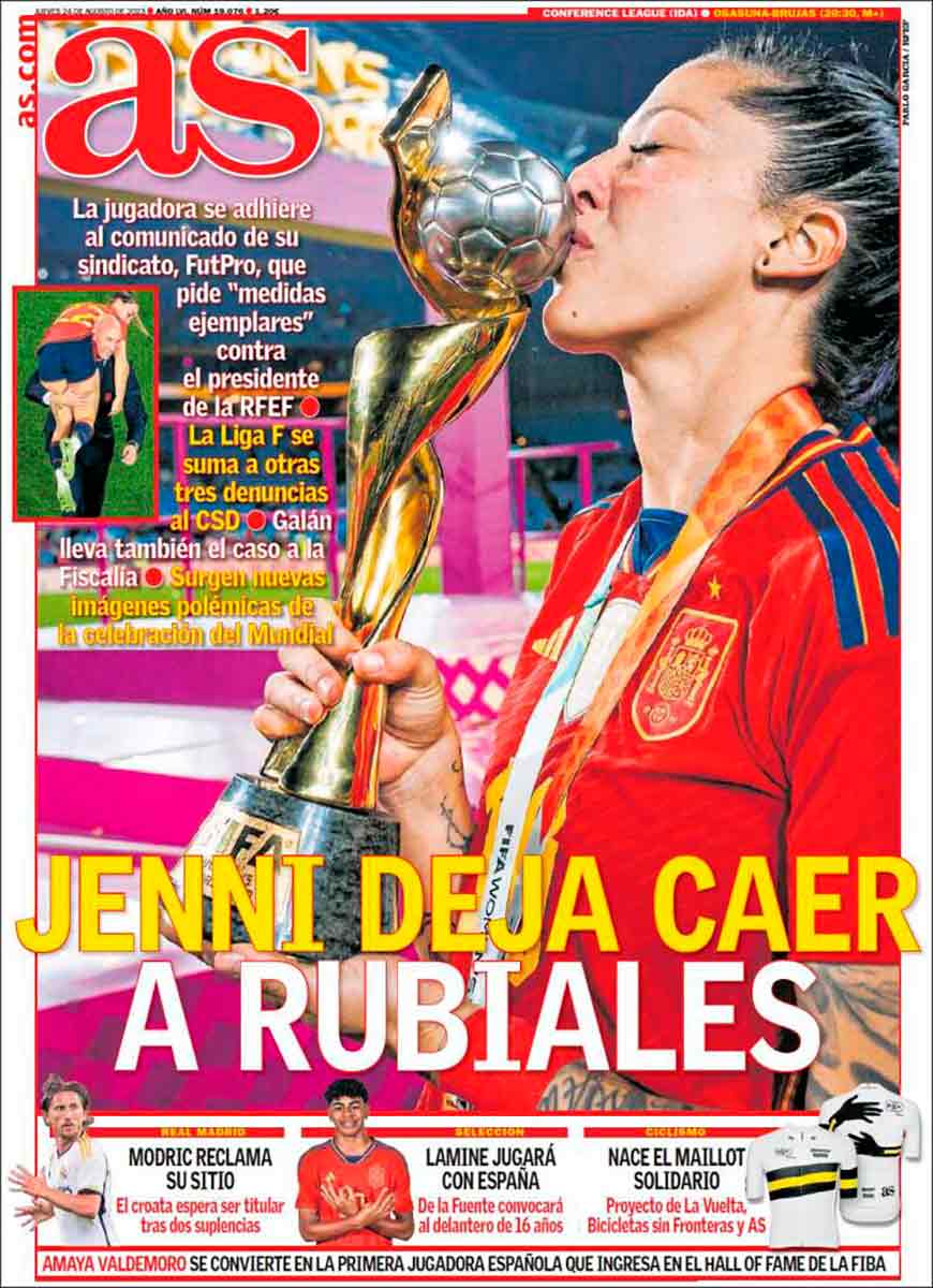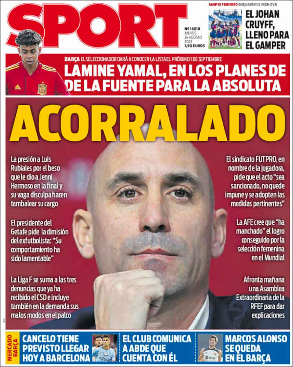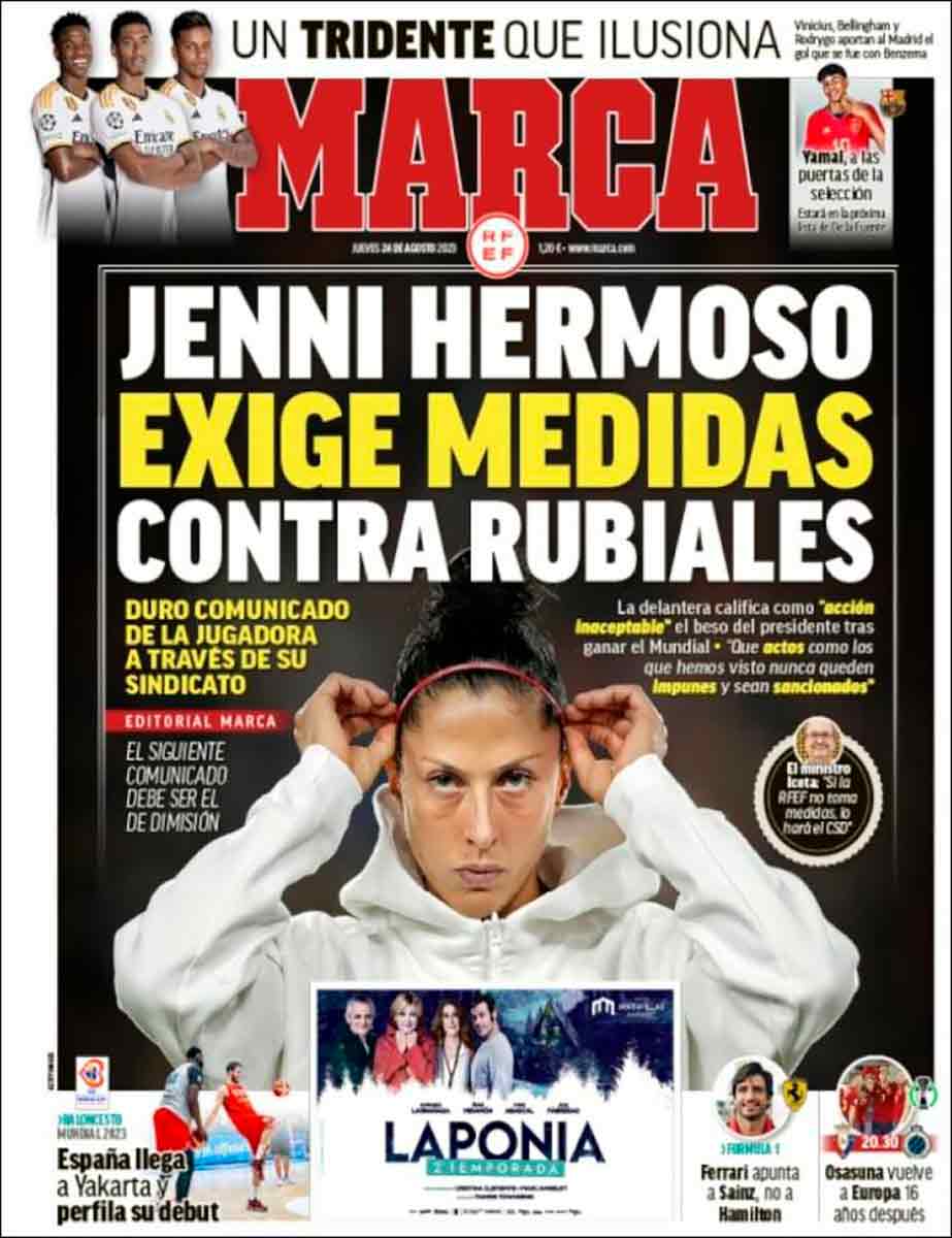 Jennifer Hermoso, a través de su sindicato, exige medidas contra Rubiales, informa Marca en su portada. También recoge las palabras de Iceta que, a diferencia del caso Barça-Negrerira, sí ha seguido este escándalo y dice que “Si la RFEF no toma medidas, lo hará el CSD”. Estamos de acuerdo en que es totalmente inaceptable el comportamiento de Rubiales, pero ha sucedido por inacción vuestra, queridos políticos.