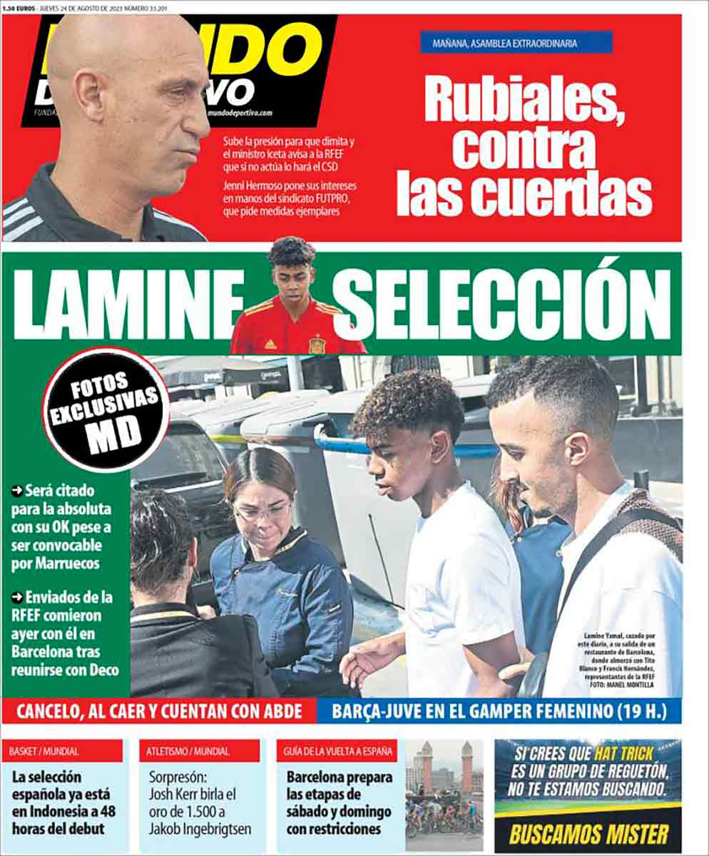 Mundo Deportivo dedica más espacio a Lamine que a Rubiales. El chaval irá convocado con la selección. Ya sabéis: si sois jóvenes, del Barça y representados por Jorge Mendes, tenéis pie y medio en combinado nacional.